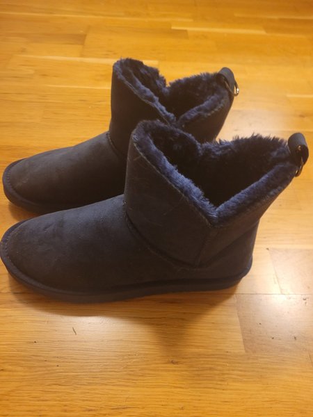 Ett par blåa boots med fuskpälsfoder. Skorna har en mjuk insida och en robust sula. De är designade för att vara bekväma och lätta att ta på och av.