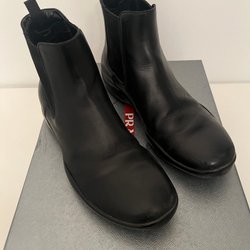 Ett par svarta Prada slides/tofflor med vit logotyp. Skorna kommer i originalkartongen och sin dustbag.