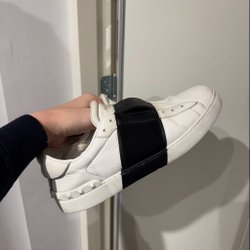 Ett par stilrena vita sneakers från Valentino Garavani med en svart detalj över foten. Skorna har en ikonisk design med nitar baktill på sulan. Perfekt för den modeintresserade.