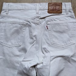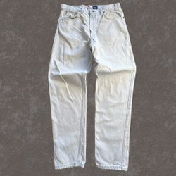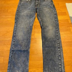 Ett par blå jeans med knappgylf. I vad jag fått fram i modellen Levi’S engineered . Tillverkad i slutet av 1990 talen till i början av 00-talet . Vridna sömmar på benen. Har snygg tvätt och slitning. Är hela men finns slitning på bakfickan, och i grenens . Men inget hål eller lagning i gren. Även lite nötta i benslutet .Detaljer med orangefärgade sömmar. Stämplade knappar i gylf och på fickor. Även insidan på knapparna har stämpel . Finns även en liten metallring , insydd i höger skärphyska.