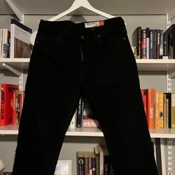 Ett par svarta jeans med en rak passform. Jeansen har en klassisk design med fickor fram och bak, samt en läderlapp med logotyp på baksidan.