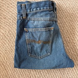 Ett par blå jeans med knappgylf och fickor fram och bak. 34/32