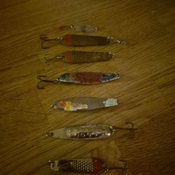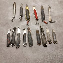 En samling av olika fiskedrag i en plastlåda. Innehåller flera typer av beten, inklusive skedar och wobblers. Lämplig för fiskeentusiaster som söker att utöka sin utrustning.