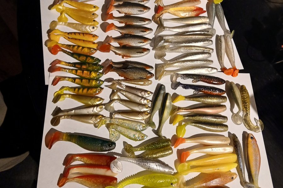 Abborre jiggar blandade storlek o färg 88 st skickas med betesbox glömde fota lådan
