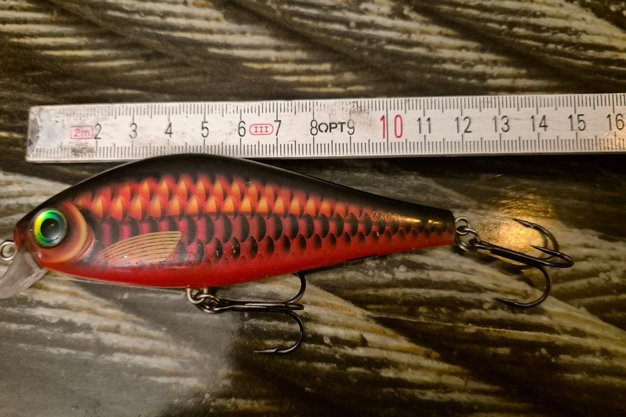 Ett fiskedrag med en röd och svart design. Utrustad med en krok och en transparent del framtill. Längd: cirka 10 cm. Passar för olika typer av fiske.