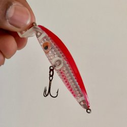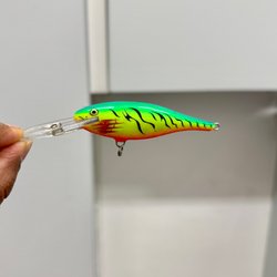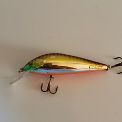 Hårdbete i form av wobbler med genomgående öglor och två trekrokfästen. Silver/vit kropp med grön/orange huvud, röda inslag och prickigt mönster, samt liten transparent skovel/läpp framtill.
