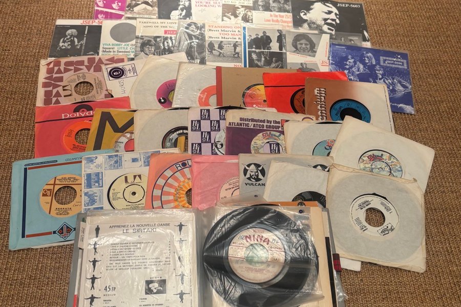 Ca 60 singlar. 15 av dessa så kallade jukebox eps enl bild. Ser ut att vara i över lag bra skick, enstaka sämre. Pärm med plastfickor i skotskutigt ingår och en del skivor i denna saknar omslag.