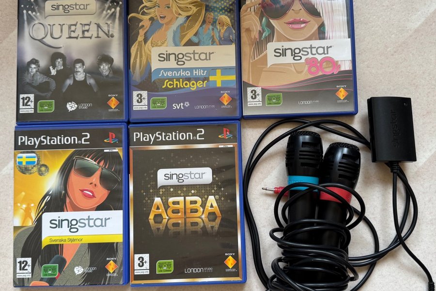 Fem Singstar-spel för PlayStation 2, inklusive Singstar Queen, Singstar Svenska Hits Schlager, Singstar 80s, Singstar Svenska Stjärnor och Singstar ABBA. Två mikrofoner med USB-adapter medföljer.