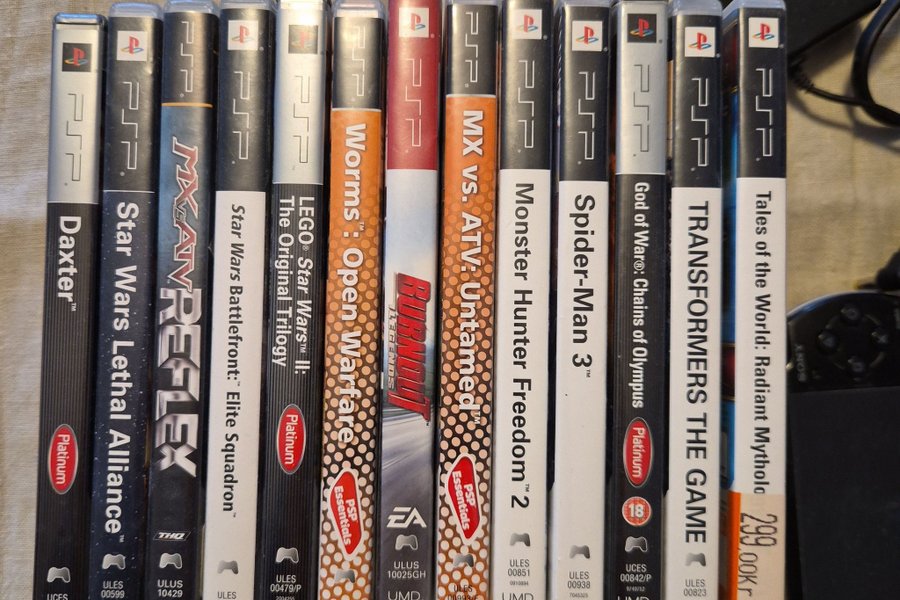 PSP-spel: Daxter, Star Wars Lethal Alliance, MX vs ATV Reflex, star wars battlefront: elite squadron, Lego Star Wars II: The Original Trilogy, Worms: Open Warfare, MX vs. ATV: Untamed, Monster Hunter Freedom 2, Spider-Man 3, God of War: Chains of Olympus, Transformers The Game, Tales of the World: Radiant Mythology.