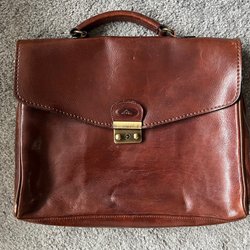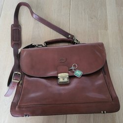 Brun portföljväska med lock och spänne. Väskan har ett handtag och detaljer i metall.