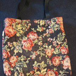 Rygsæk med et blomstret mønster i blå og rosa farver. Tasken har en lynlåslomme foran og et stort rum med lynlås.