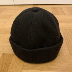 Svart stickad mössa med en vit fyrkantig etikett med ”C.W. (by carin wester)” på framsidan. Mössan har en ribbstickad kant.