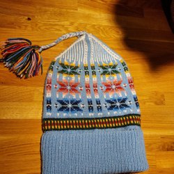 Denna ljusblå stickade mössa har ett vackert mönster på uppvikt kant och en avtagbar tofs. Mössan är stickad från angora garn (Adriafil, italien)