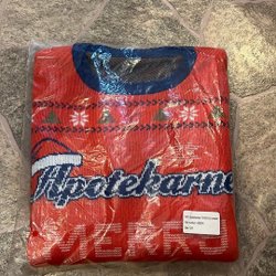 Röd och vit stickad mössa med Coca-Cola logga och en röd tofs. Mössan har ett mönster med renar och snöflingor.