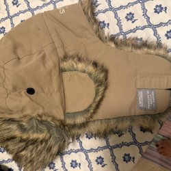 Beige stickad mössa med fuskpäls detaljer och flätade band.