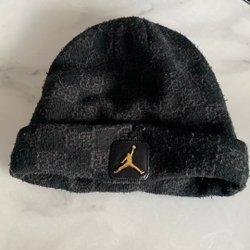 Grå stickad mössa med en etikett framtill. På etiketten står det "DESIGNED IN GALLSTAD EST. 1939".