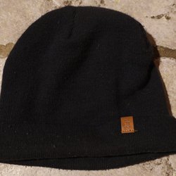 En mörkblå stickad mössa med en uppvikt kant.