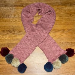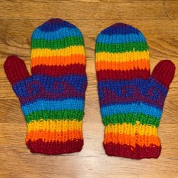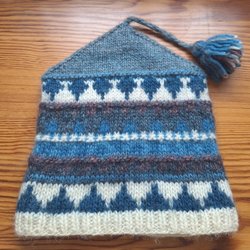 Stickad mössa med randigt mönster i färgerna svart, vit, gul, röd och grön, med svart pompom i toppen. Längd 57cm, bredd ca 25 cm