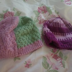 - Twee gebreide mutsen in roze, groen en paars, één voor volwassenen en één voor kinderen, handgemaaktEindtijd20 mrt 17:52.Prijs:EUR 7,00,Startprijs.