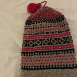 Stickad mössa med en bred, grön kant. Mössan har ett mönster med inslag av flera färger.