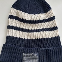 Mörkblå stickad mössa med en ribbad textil.
