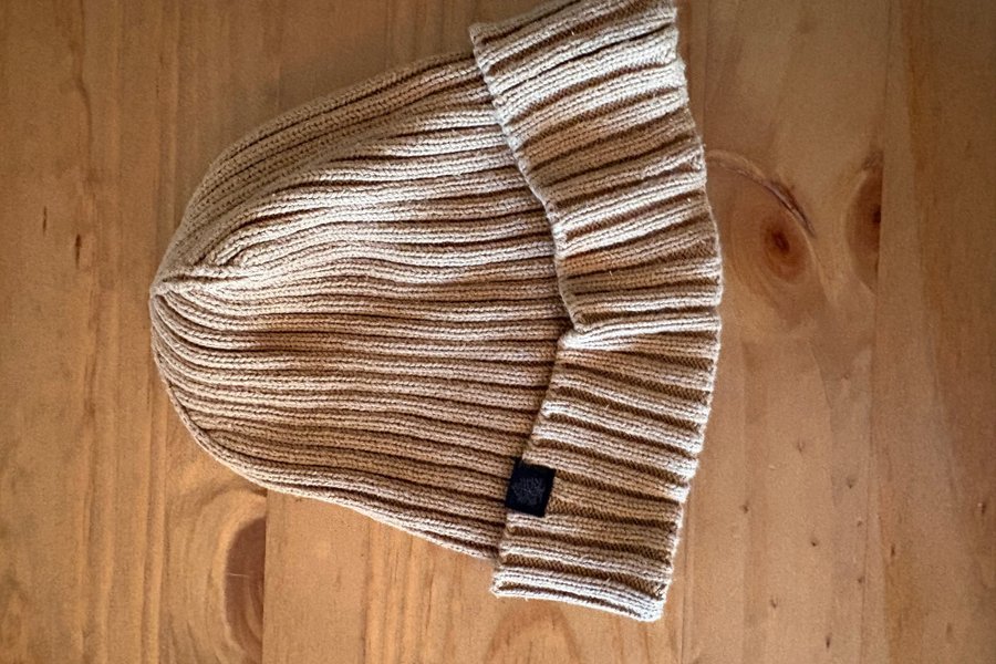 En ribbstickad mössa i en neutral färg. Mössan har en uppvikt kant och en liten svart etikett diskret placerad på sidan av kanten.