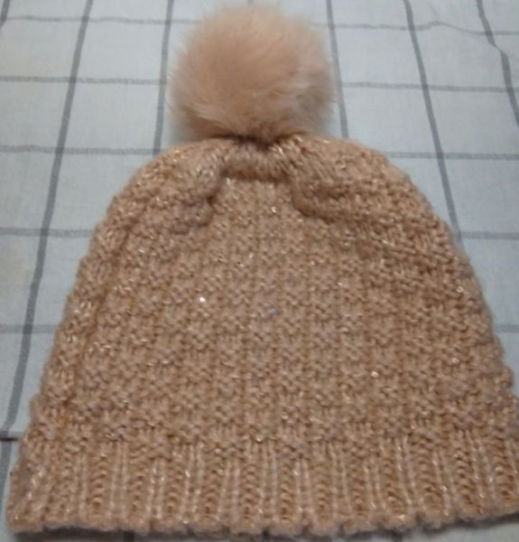 En stickad mössa i en ljus färg med en fluffig tofs upptill. Mössan har ett fint glitter i sig.