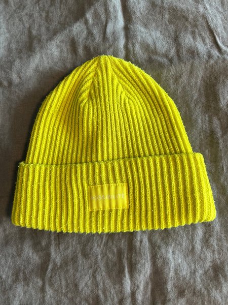 En stickad mössa i en stark gul färg. Mössan har en ribbad struktur och en liten fyrkantig etikett med text framtill.