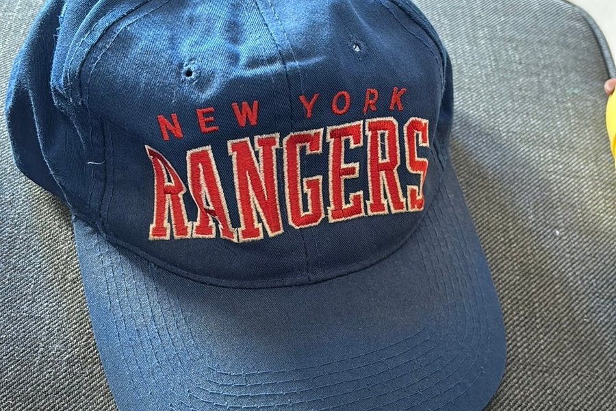 En keps med texten "NEW YORK RANGERS" broderad i rött med vit kontur på framsidan. Kepsen är enfärgad i en mörkblå nyans.