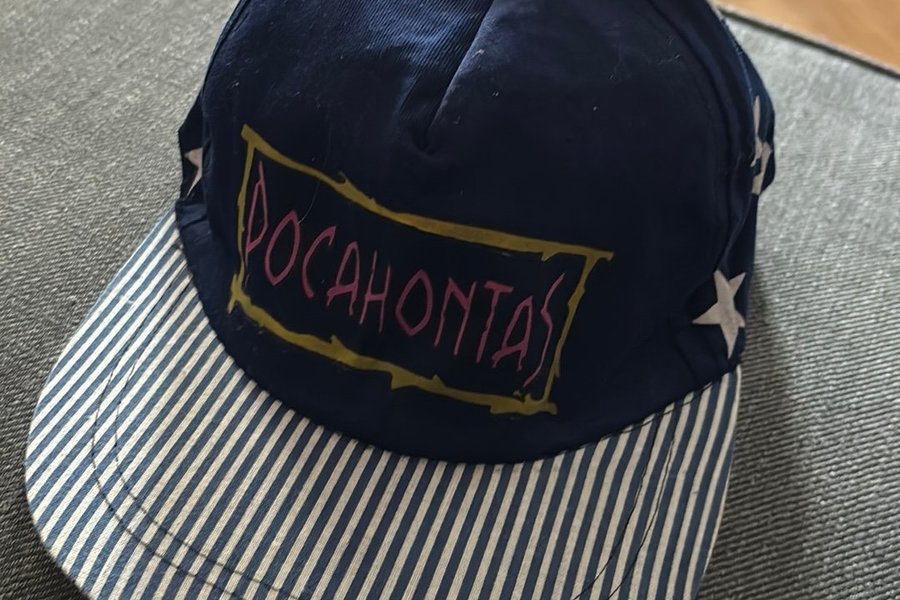 Keps med texten "POCAHONTAS" i rosa på en gul bakgrund. Skärmen har ett randigt mönster i vitt och blått. På sidorna av kepsen finns vita stjärnor. barnstorlek