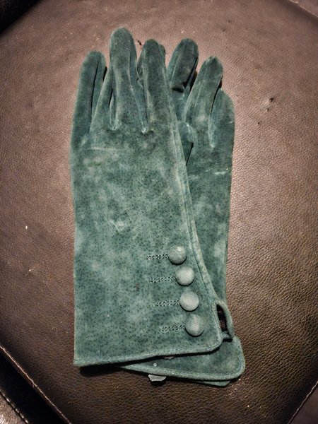 Ett par eleganta handskar i en vacker grön nyans. Handskarna har en klassisk design med tre dekorativa knappar vid handleden.