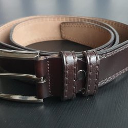 Brunt bälte med ett elastiskt parti och ett metallspänne. Svart på insidan. Ca 120 cm långt inkl. spännet och ca 3 cm brett. Slitet, men ok fungerande skick.