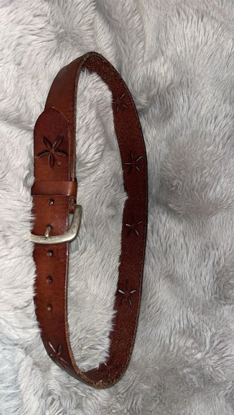 Bälte i brunt läder med utskurna stjärnliknande mönster längs hela bältet. Spännet är i silverfärg.