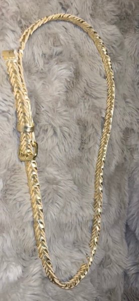 Ett guldfärgat bälte med en flätad design. Bältet har ett spänne som gör det justerbart.