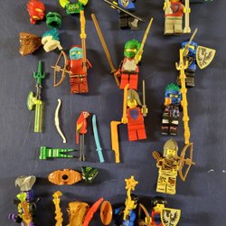 Ett sortiment av Lego-delar och tillbehör. Inkluderar kroppar, verktyg, vapen och andra diverse föremål. Perfekt för att komplettera din Lego-samling eller för kreativa byggprojekt.