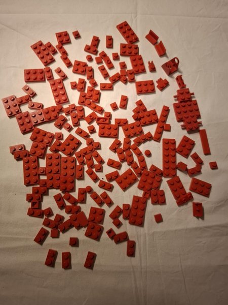 Ett sortiment av röda Lego-bitar i olika storlekar och former. Perfekt för att komplettera din Lego-samling eller för kreativa byggprojekt.Tunna bitar 167st