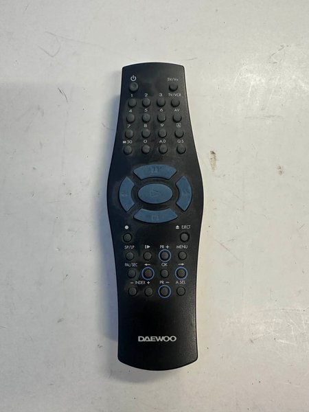 Fjärrkontroll från Daewoo. Modell med knappar för TV/VCR, SV/V+, AV, EJECT, SP/LP, PAL/SEC, INDEX, PR+, PR-, MENU, OK och A.SEL.