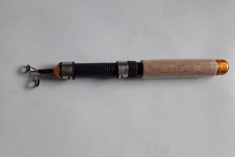 Pimpelspö Teleskåp med korkhandtag, uppdragen ca 25 cm,utdragen ca 60 cm,vikt 60 g. Styv topp. Passar perfekt för grövre fiske såsom Rengbåge, Röding och Öring. Nytt.