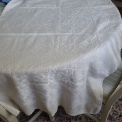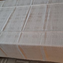 Duken är vävd på Hälsinge Linneväveri, den är i mycket fint skick. Det finns en svag ljusare fläck på duken, syns knappt i verkligheten (se bild 1)