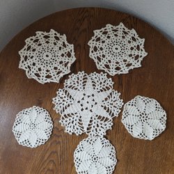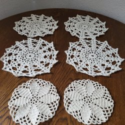 2 vita 1 ljust beige duk, virkade, storlek 15 x 15 cm. Den beiga något mindre, ca 13x13 cm.