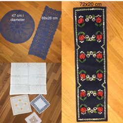 Virkad löpare i rutor i acrylgarn. Färgerna är vitt och melerat. Storlek ca 40x40 cm.