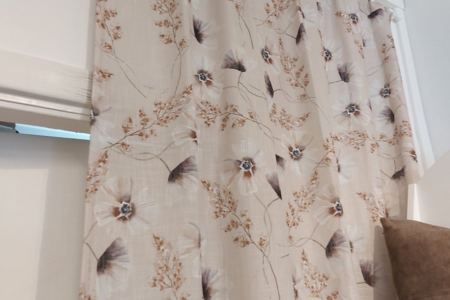 En fin gardin med ett blommigt mönster som kan passa bra i vardagsrummet eller sovrummet. Den har en ljus bakgrundsfärg med mörkare blommor och blad.