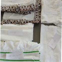 Två vita gardinlängder med ett diskret blom-bladmönster. Gardinerna har öljetter för enkel upphängning. Måtten är ca: 217 cm lång och 128. cm bred.