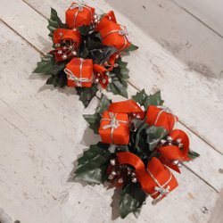 En julröd gardinkappa med vit spetskant.