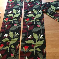 Två panelgardiner i röd färg.