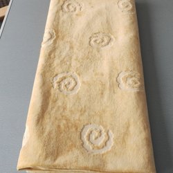 Ett tyg med ett randigt mönster med prickar i blått och gult.