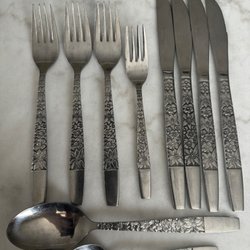 Bestick säljes, tre gafflar, tre knivar och två små skedar i annorlunda form