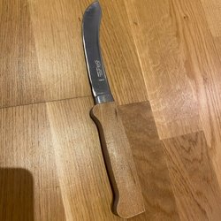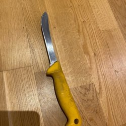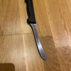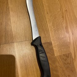 Kniv med blad i rostfritt stål. Handtag i svart material. Bladet är märkt med 'PROFESSIONAL' och 'STAINLESS'.
