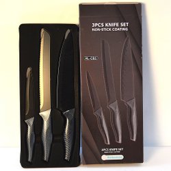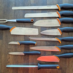 Set med 10 knivar. Inkluderar kockknivar, brödknivar och filéknivar. Några av knivarna är av märket 2 st EKA ,kn ,GastroMax 3 st frost ,mm