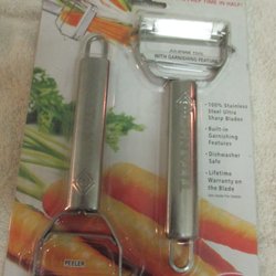Diverse köksredskap såsom potatis- och vitlökspress, stektermometer, äppeldelare, citruspress, slevar, tesil, isformar och knäcktratt. Ett bra-bha kit i köket.